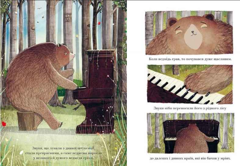 Ведмідь-піаніст Авт: Літчфілд Девід Видавництво Старого Лева. Одного дня ведмежатко знаходить у лісі щось дивне. Мимохіть торкнувшись до клавіш, воно вирушає у довгу дорогу, яка веде його з рідного дому до далекого й дивовижного краю, де у повітрі бринять прекрасні звуки, а слава та багатство тільки й чекають, щоб їх здобули. Місто цілком виправдало ведмедеві сподівання, проте глибоко в його серці раптом озвалася туга.