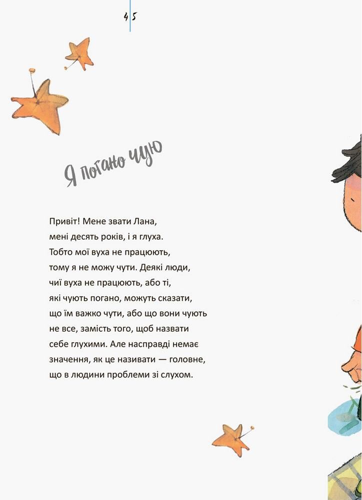 Живи та вчись У мене порушення слуху Кенгуру Ранок. Мета цієї книжки розказати про глухоту та проблеми зі слухом у дітей на прикладі людей із такими вадами. Автори сподіваються, що книжка зруйнує деякі стереотипи щодо глухоти і допоможе дітям більше дізнатися про глухоту та прийняти її. Чи знали ви, що, за даними Національного інституту глухоти та інших розладів у спілкуванні, 2/3 кожної тисячі дітей у США народжуються глухими або майже глухими, а 9 з 10 глухих від народження дітей народжуються в батьків, які чують?