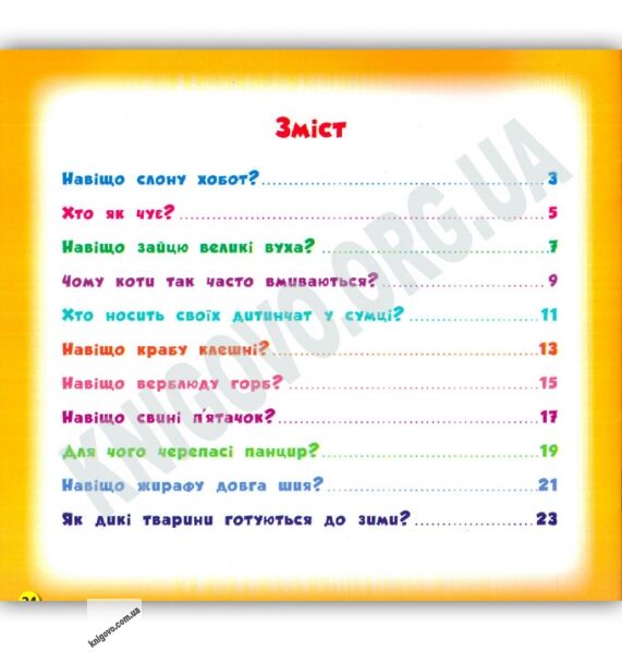 Книга містить низку казок, які в доступній формі познайомлять малюків із тваринним світом і допоможуть знайти відповіді на найцікавіші запитання про диких та свійських тварин.