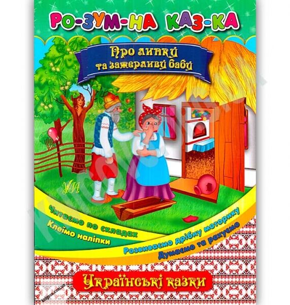 Українські казки з наліпками Про липку та зажерливу бабу. Ваш малюк починає читати й рахувати? Запропонуйте йому книжку із серії Розумна казка! На її сторінках ви знайдете не тільки добре знайомих казкових героїв, а й цікаві завдання, відповіді на які слід шукати серед різнокольорових наліпок. Разом із персонажами діти потренуються в читанні й лічбі до 10 та розвинуть дрібну моторику.