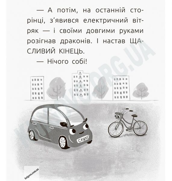 Тільки електричні вітряки можуть перемогти дракона. Тож електромобіль Сашко та велосипединка Юля вирушають на пошуки цих дивовижних створінь. Сповнене фантазії та гумору оповідання Олесі Марчич знайомить юних читачів із сучасними екотехнологіями та запрошує подивитися на добре відомі речі по-новому.