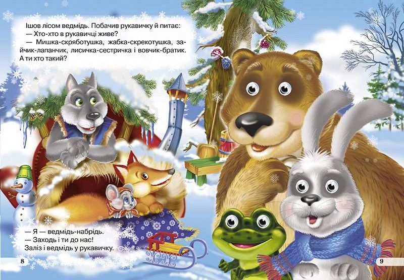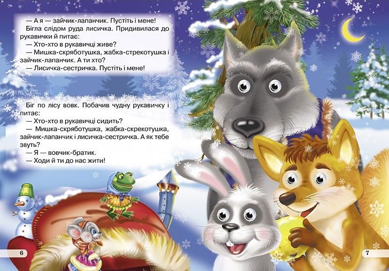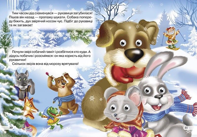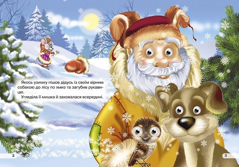 Казка про те, як дід пішов за дровами і загубив рукавичку, яка стала тимчасовим будиночком для мешканців зимового лісу.