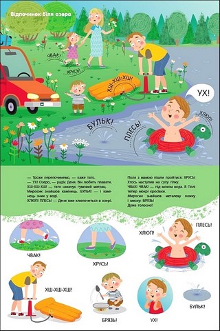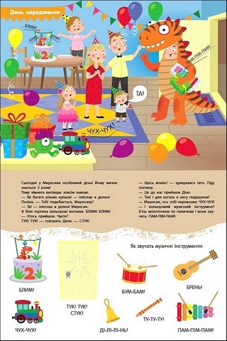 Перші звуки — перші кроки до мови! Разом із кумедним і допитливим Миросиком дитина відкриє чарівний світ звуків, якими "говорять" предмети, тварини, люди й усе навколо: РИП! ТУП! ВЖУХ! ДЗЕЛЕНЬ! Ця книжка створена спеціально для найменших (від 1 року) та малят, які затримуються з мовленням. Вона знайомить з фонетичними висловами, сприяє розвитку звуковимови, інтонації, емоційного відгуку й готує дитину до наступного мовленнєвого етапу — перших слів. Усе — у грі, з любов’ю й у теплому колі родини Миросика.