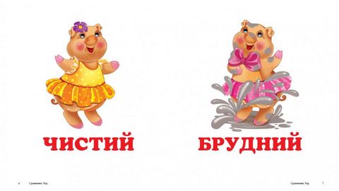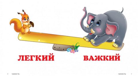 Як дохідливо розповісти малюкові про поняття «багато» і «мало», «твердий» і «м’який»? А що можна позначити словом важкий? На перший погляд ніби й нічого складного. Важкий — отже багато важить. Ось, приміром, слон важкий... А це більше, ніж пароплав? Ні, звичайно. Чому ж тоді слон важкий і пароплав важкий? Ось бачите, як складно знайти відповіді до «дитячого запитальника»! Те, що дорослому очевидно, мислення дитини сприймає як відкриття. Адже для крихітки все вперше. І поняття порівняння теж. Ця книжка стане гарним помічником у розвитку в малюка логічного мислення. Вона знайомить з принципами порівняння наочно, у малюнках, разом із веселими пустотливими тваринами та відомими предметами. Тут можна з малюком і порахувати пташок, і прочитати по літерах, які жираф і бегемот навпроти нього, а подивившись на обох свинок, розповісти й показати, що чистим бути добре, а брудним —погано.