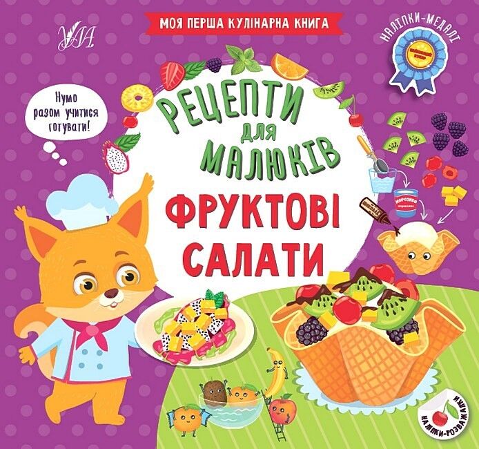 Книжка «Фруктові салати» із серії «Рецепти для малюків» допоможе дитині навчитися готувати перші солодкі десертні салати. У цьому виданні з урахуванням вікових можливостей дитини підібрано рецепти смачних і корисних страв: перелік інгредієнтів, покрокова інструкція з приготування та дбайливі поради від шеф-кухаря. Стимулом для роботи з рецептами стануть наліпки-медалі, а розважальним бонусом — наліпки смаколиків. Книжка буде гарним подарунком і допоможе організувати цікаве й корисне дозвілля для дитини.