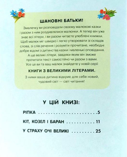 До збірки увійшли найвідоміші казки, призначені самостійного читання дітьми. Читаючи сторінку за сторінкою, малята познайомляться із сюжетом казок та навчаться краще читати. Книга представляє казки "Ріпка", "Кіт, козел і баран", "У страху очі великі".