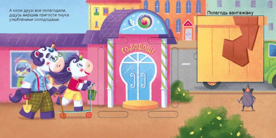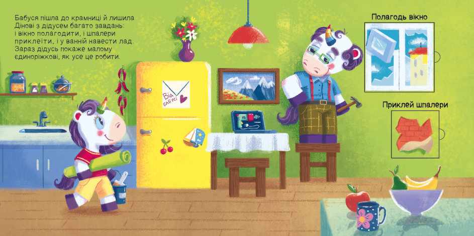 Щоб допомогти єдноріжку Діну виконати всі завдання, малюкові знадобляться фігури різного розміру. Їх дитина знайде тільки відкривши книгу.