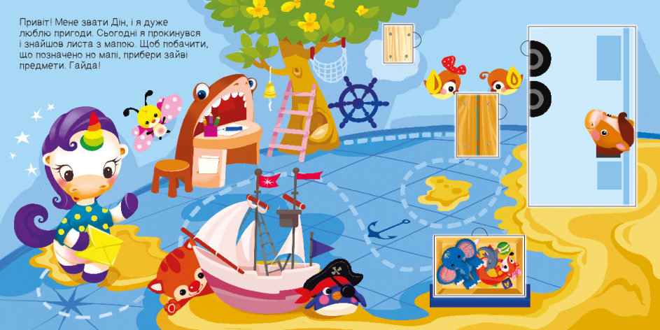 Щоб допомогти єдноріжку Діну виконати всі завдання, малюкові знадобляться фігури різного розміру. Їх дитина знайде тільки відкривши книгу. А потім почнеться захоплююча гра, в якій потрібно буде: шукати, підбирати і правильно використовувати ці фігурки.