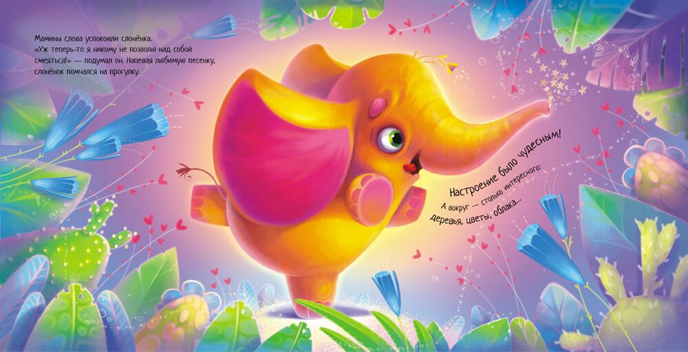 Це історія про слоника, який уперше вирушив гуляти без мами. Він був радий і почувався дуже дорослим. Але звірі, яких він зустрічав, насміхалися зі слоненяти, адже в нього такий довгий ніс, великі вуха й саме воно чималеньке. Слоненя так засмутилося... Добре, що мама знає, як показати малюкові, що бути слоном дуже гарно!