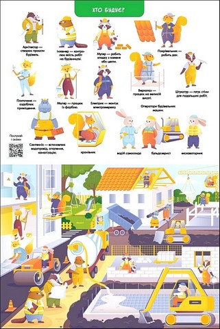Хто будує будинки, навчає дітей, лікує, вирощує врожай або створює книжки? Разом із цією захопливою картонкою малюк дізнається, хто й чим займається в місті, селі чи навіть у великому мегаполісі! «Де яка професія?» — це словник-віммельбух, що знайомить дітей із різноманітними професіями в ігровій формі. У книжці малюк не просто чує нові слова, а бачить їх у дії: на яскравих ілюстраціях — лікарі, вчителі, поліцейські, будівельники, кухарі, фермери, актори, письменники, айтішники та багато інших. Ідеально підходить для дітей від 4 років, які активно поповнюють словниковий запас та починають формулювати перші складніші речення.