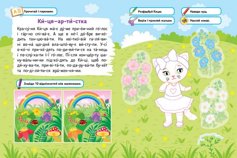 Кожен розворот книжки «Киця» — то цікава пригода, під час якої дитина прочитає історію, розфарбує її головного героя, наведе по пунктиру елементи, виріже й приклеїть частини малюнка, доповнить його тематичними наліпками, а також виконає завдання з математики, читання, логіки тощо. Ігрове дозвілля допоможе не лише створити маленькі шедеври власноруч, а й покращить навички читання, потренує пам’ять та увагу, розвине логічне мислення та уяву, розширить словниковий запас і поліпшить дрібну моторику пальців рук.