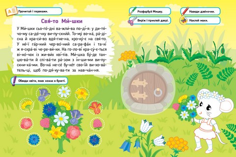 Кожен розворот книжки «Мишеня» — то цікава пригода, під час якої дитина прочитає історію, розфарбує її головного героя, наведе по пунктиру елементи, виріже й приклеїть частини малюнка, доповнить його тематичними наліпками, а також виконає завдання з математики, читання, логіки тощо. Ігрове дозвілля допоможе не лише створити маленькі шедеври власноруч, а й покращить навички читання, потренує пам’ять та увагу, розвине логічне мислення та уяву, розширить словниковий запас і поліпшить дрібну моторику пальців рук.