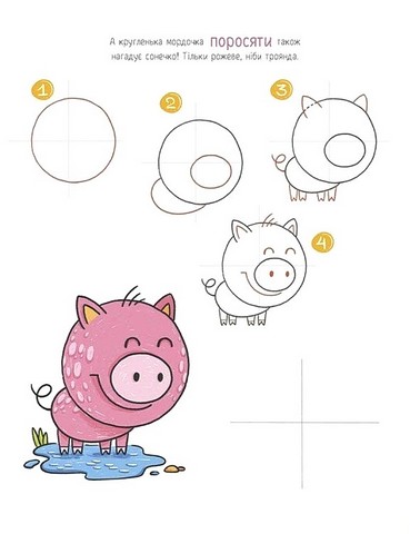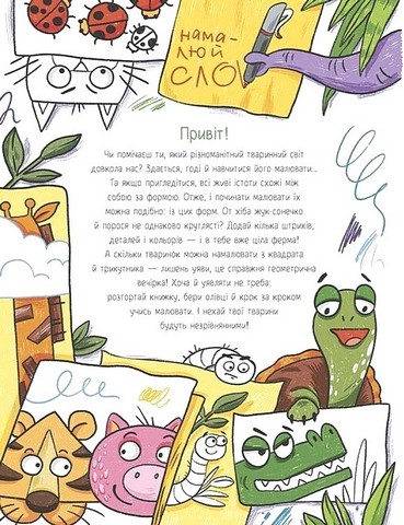 Ваша дитина вже помічає, який різноманітний тваринний світ? Тоді пора навчитися його малювати! Це геть не складно, якщо починати малюнки із простих із геометричних фігур. На сторінках цієї книжки-малювалки є покрокові інструкції, повторюючи які вдасться намалювати і поросяток, і жабку, і тигра, і навіть крокодила. Перший крок — це завжди геометрична фігура, яку дитина ну точно вже вміє малювати: коло, квадрат, трикутник... А далі варто додати лише деталей, кольорів і трішки фантазії.