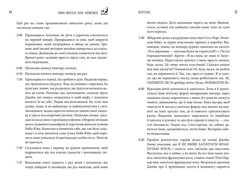 Чому матуся хоче напитися? Тому що кожного дня на неї чекає нове випробування: двоє чудових дітлахів часом перетворюються на чортяк, затишний будинок — на вирву від бомби, коханий чоловік за будь-якої нагоди тікає з хати… додайте до цього пришелепкуватих родичів і кодло ідеальних мамць зі школи — як тут не з’їхати з глузду? Незламна матуся з неперевершеним почуттям гумору іноді укріплює бойовий дух міцним слівцем і не менш міцними напоями. не закликаємо брати її за приклад, але читати обов’язково, адже сміятися корисно для здоров’я!