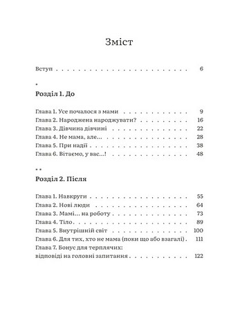 \nТут ви не знайдете повчань і порад з виховання або рекомендацій зі самовдосконалення, зате отримаєте списки класних книг і фільмів, низку життєвих історій про те, як не загубитися і не розгубитися, коли життя і світ вигадують дедалі нові випробування. Прочитавши книжку, можливо, відчуєте, що ви у своєму досвіді не самотня. Ця книжка про всіх мам. І для всіх мам. Для приємного та легкого читання людей будь-якого віку, статі, зросту та статусу.