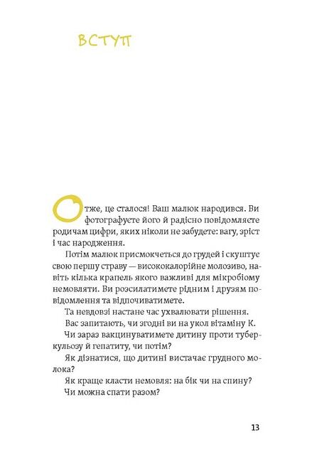 З народженням дитини ваш дім наповниться сміхом, плачем, іграшками та щастям, а голова розпухатиме від безлічі запитань і потреби ухвалювати рішення. Чи робити немовляті укол вітаміну К? Як дізнатися, що дитині вистачає грудного молока? Як краще класти немовля: на бік чи на спину? Коли вакцинувати дитину? Щодня ви запитуватимете себе: чи правильно я роблю? У сучасному світі через засилля інформації важко зрозуміти, що саме допоможе насамперед.