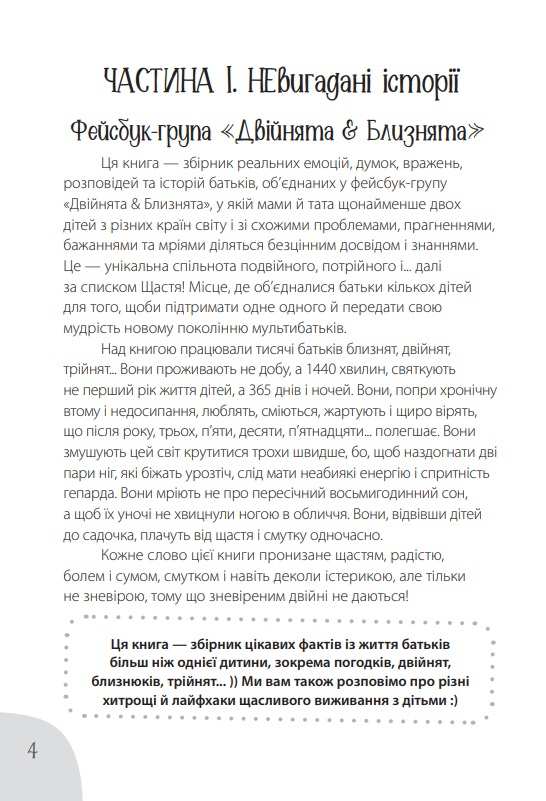 Коли лелека постарався Книга для батьків близнят двійнят погодків Вільк М. Основа. Для турботливих батьків. Ця книга не залишить байдужим нікого! У ній зібрано унікальний досвід і знання реальних батьків двійнят, трійнят (щонайменше двох дітей!) з різних країн світу, об’єднаних у Фейсбук-групу «Двійнята & Близнята». Мами й тата діляться знаннями і лайфхаками, що допомагають їм жити повноцінно й щасливо у сім’ї з декількома маленькими дітьми.