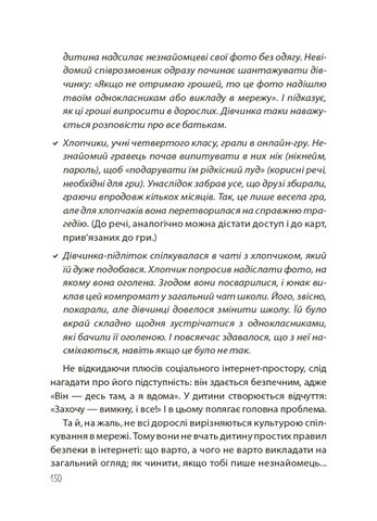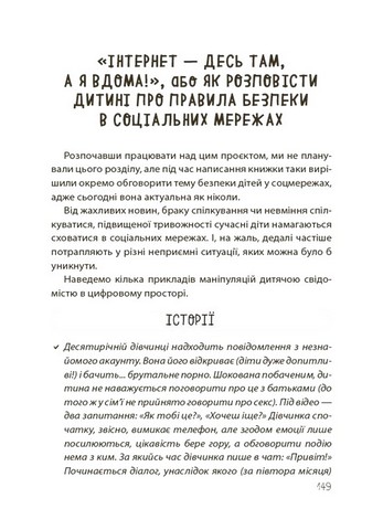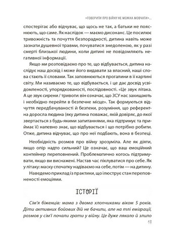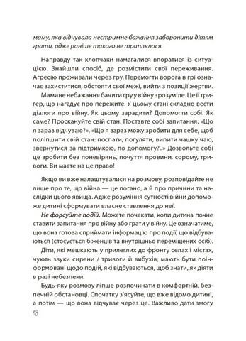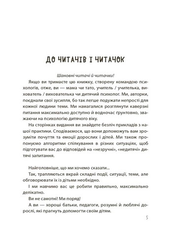 \nНа сторінках видання — безліч прикладів з практики психологів, які допоможуть зрозуміти почуття та емоції дітей і дорослих. Також запропоновано алгоритми спілкування в різних ситуаціях, щоб підготувати дорослих до обговорення складних тем з дитиною в екологічний спосіб, унеможливлюючи заподіяння психологічних травм.Упевнені, що любов, батьківська інтуїція плюс практичні рекомендації цієї книжки допоможуть вам підтримати свою дитину, додати їй сил та впевненості, щоб успішно долати труднощі й розв’язувати будь-які проблемні ситуації.