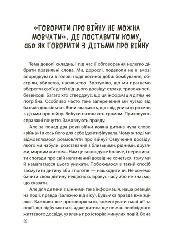 \nКнижка побачила світ під час війни, щоби допомогти батькам і їхнім дітям упоратися з можливими труднощами, розв’язувати проблеми, а не залишатися з ними на самоті. Авторки пропонують конкретні відповіді на різні, часом доволі складні, «недитячі» дитячі запитання мирної та воєнної тематики.