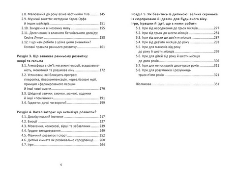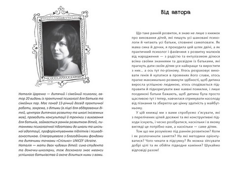 Книжку створено для дбайливих батьків, які прагнуть не лише збагатити дитину знаннями чи розвинути в неї певні навички, а якнайповніше розкрити її потенціал і природні таланти, щоб зрешти виховати гармонійну і щасливу особистість. У книжці докладно розглятнуто єтапи, закономірності й найпопулярніші методики раннього розвитку дітей, а токож умови, що сприяють набуттю малюками особистого досвіду, необхідного для всебічного розвинення.