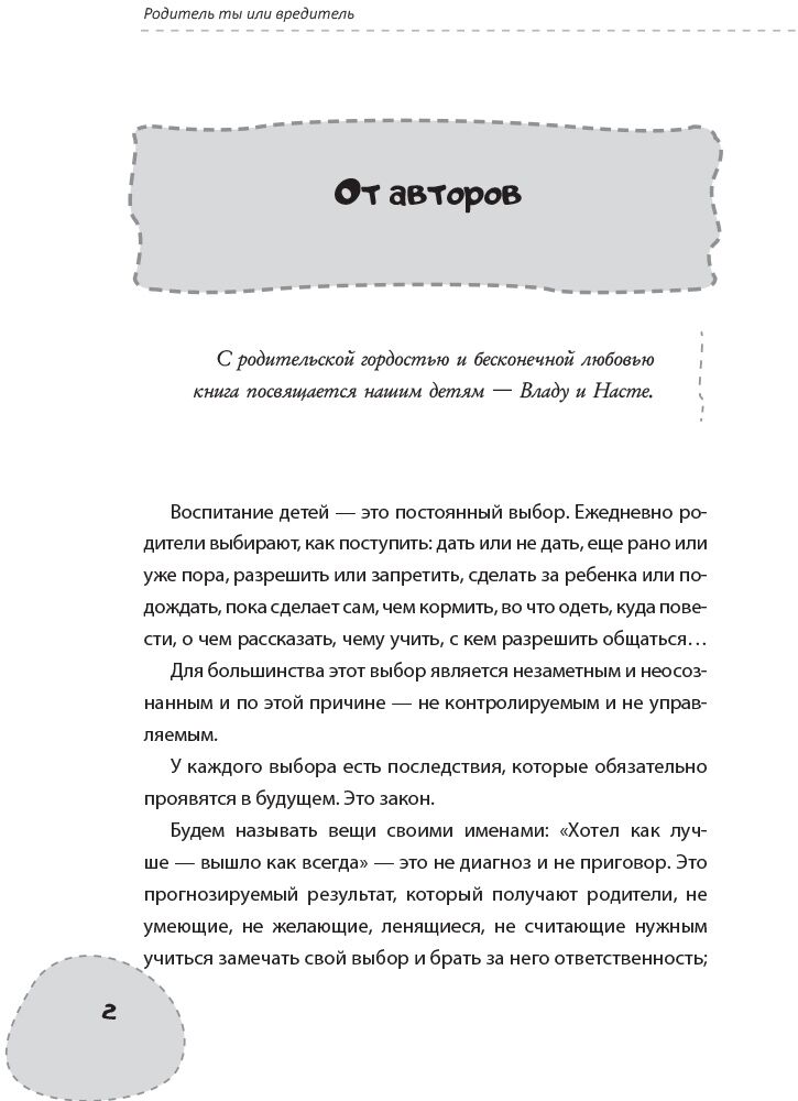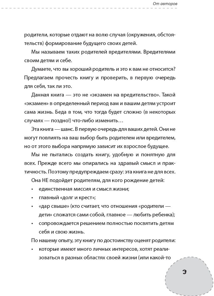 Эта книга — набор практических инструментов для тех родителей, которые имеют много личных интересов, хотят реализоваться в разных областях своей жизни так, чтобы это было не в ущерб отношениям с детьми и их будущему. "Хотел как лучше — вышло как всегда", — это не приговор. Это прогнозируемый результат тех, кто не хочет, ленится, не умеет и не считает нужным учиться правильному формированию желаемого будущего для своих детей. Тех, кто снимает с себя ответственность, обвиняя обстоятельства.