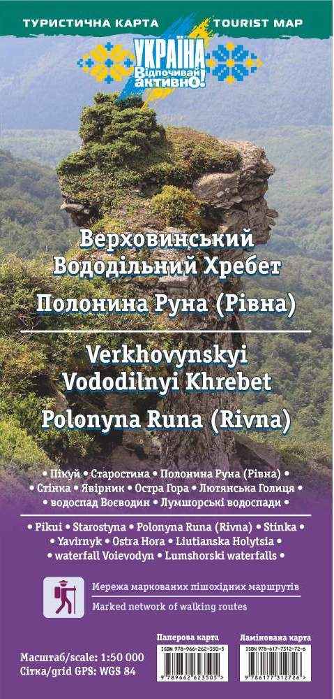 Туристична карта Верховинський Вододільний Хребет Полонина Руна (1:50 000) друге видання ЛАМІНОВАНА КАРТА. Більшість з поданих територій перевірена власними виходами в гори, які проводили наші партнери - фундація "Карпатські стежки", яка й безпосередньо займається маркуванням пішохідних маршрутів та встановленням вказівників на території Українських Карпат.