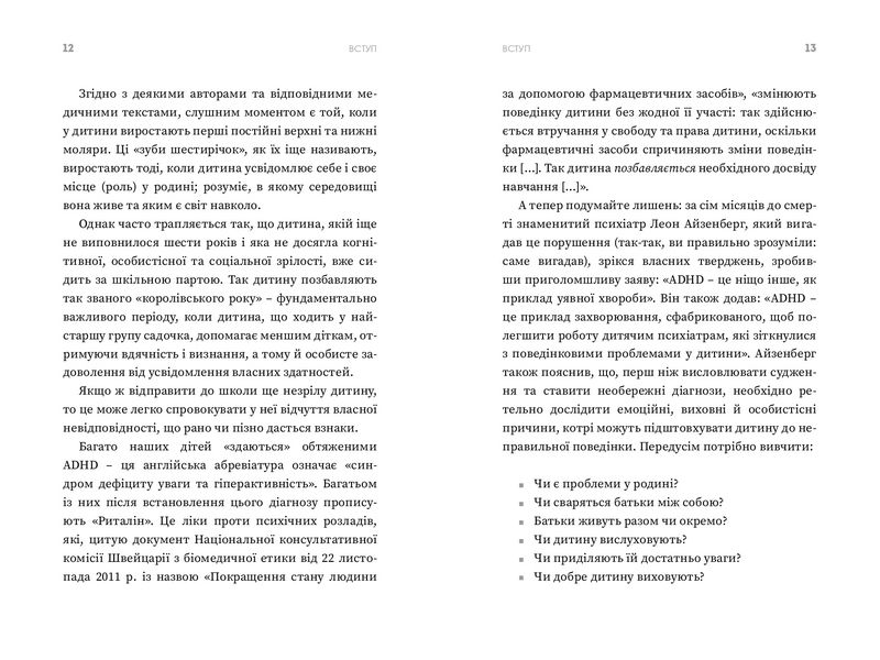 Гіперактивні, тривожні, невгамовні, неуважні, закриті, самотні, нездатні зосередитися, особливо у школі: сьогодні наші діти піддаються рівню емоційного та соціального стресу, який у минулому годі було уявити. А ми не завжди вміємо відрізнити особистісну рису від порушення, а порушення – від захворювання. Навчімося робити це, щоби дати дітям змогу рости в якнайкращих умовах!Книга з’явилася на світ українською мовою завдяки ідеї, старанням і фінансовій підтримці Ольги Косенко, лікарки-стоматолога-терапевта, лікарки-стоматолога-ортопеда, лікарки-ортодонта.