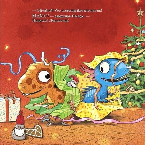 Різдво — час гучних пісень, забавок і, головне, сюрпризів! Расмус і Тіммі вже підготували чудові дарунки для своїх рідних. Залишилось красиво запакувати — і прямісінько під ялинку. Проте загорнути деякі подарунки виявилося непростою справою: скотч та клей повсякчас опинялися деінде, а не на пакунку… Що зрештою вийшло? Читайте в цій книжці.