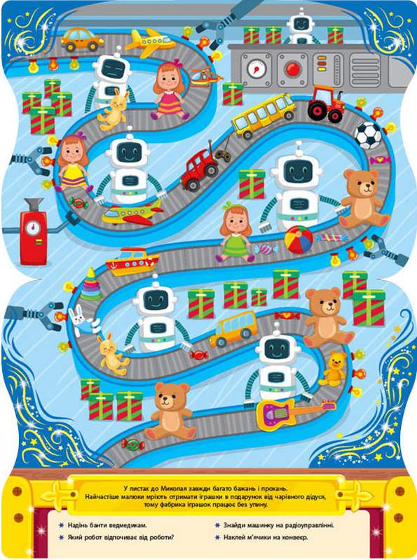Підтримайте чарівну атмосферу гарним подарунком у вигляді незвичайної книжки-скриньки «Подарунки від Миколая». З перших сторінок маленькі читачі поринуть у казковий світ чарівної майстерні святого Миколая та його помічників, який дитина доповнить наліпками.