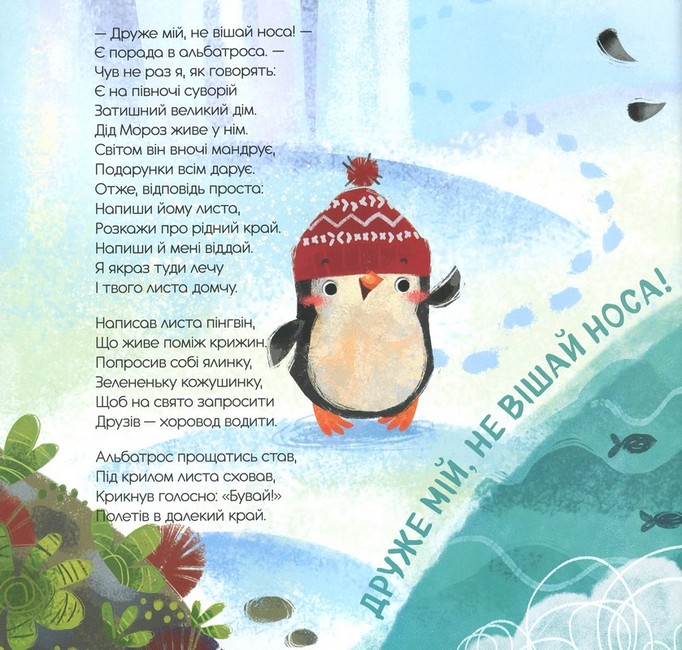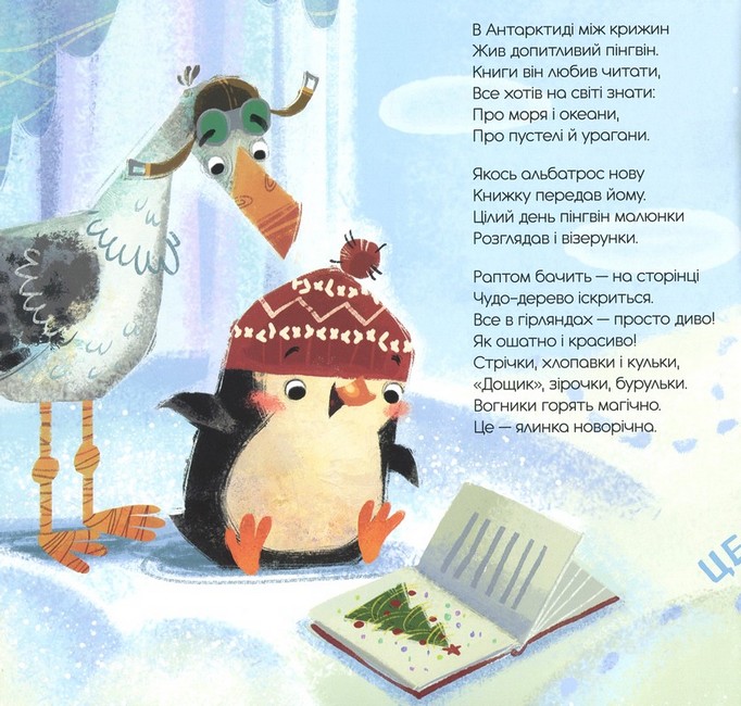 Далеко в холодній Антарктиді жив маленький допитливий пінгвін, який дуже любив читати. Одного разу він побачив у книзі чарівну ялинку і страшенно захотів мати її у себе. Вихід залишався один — написати листа доброму Діду Морозу! Усі-усі звірі допомагали маленькому пінгвіну і передавали одне одному листа, аби він потрабив до Дідуся. Ось так з вірою і взаємодопомогою можна створити різдвяне диво.