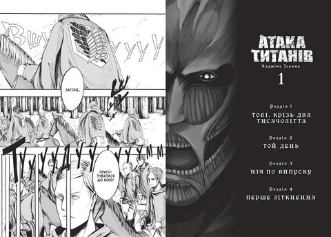 \n«Атака титанів» — темна фентезі-манґа, створена Хаджіме Ісаямою. Сюжет розгортається в постапокаліптичному світі, де залишки людства ховаються за трьома величезними стінами, щоб захиститися від жахливих істот — титанів. Історія розповідає про молодого хлопця Ерена та його друзів Мікасу та Арміна. Спокійне життя трійці руйнується, коли один із титанів прориває зовнішню стіну, дозволяючи монстрам увірватися у місто. Герої вступають до військового корпусу, щоб боротися з титанами, розкривають приголомшливі таємниці їхнього походження та дізнаються про природу світу, в якому вони живуть.