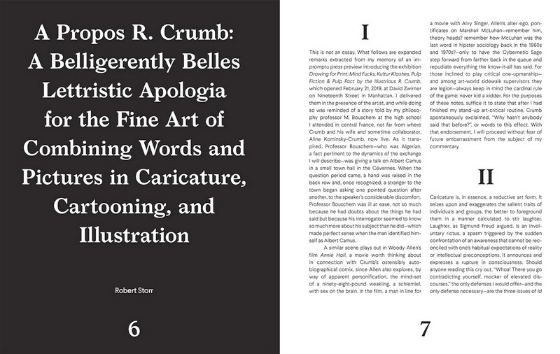 Ця публікація документує визнану критиками виставку Drawing for Print: Mind Fucks, Kultur Klashes, Pulp Fiction & Pulp Fact від Illustrious R. Crumb у Девіді Звірнері, Нью-Йорк, у 2019 році, яку курував Роберт Сторр. Ця публікація пропонує можливість зануритися в Особливий розум Крамба. У супровідному тексті Сторр досліджує складну природу деяких робіт Крамба та важливість митців, які приймають статус-кво.