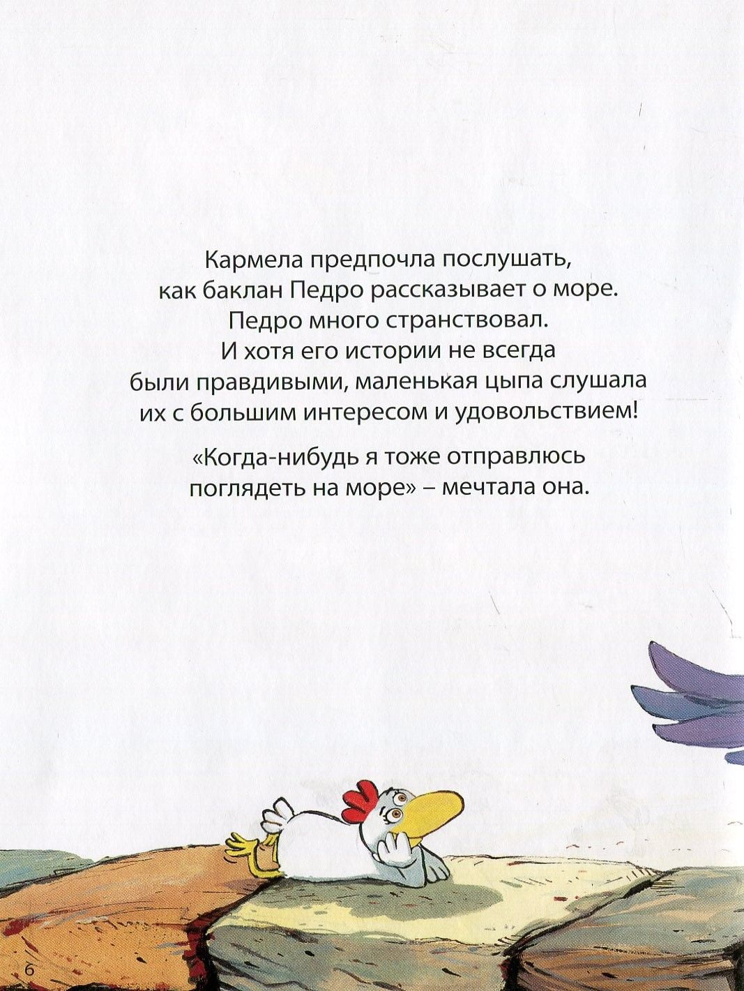"Нестись, нестись, вечно нестись! В жизни есть вещи поинтереснее! Я хочу увидеть море!"- воскликнула Кармела. Ее папа Петух в жизни не слышал ничего глупее. "А ну-ка, быстро в гдездо!" - произнес он.