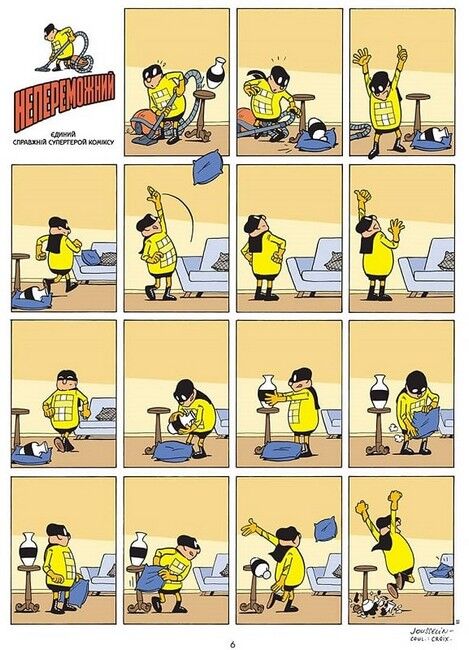 Паскаль Жусселен перетворив сітчасту структуру сторінок коміксу на поле для наративних експериментів, на ігровий простір, де персонажі мають повну свободу пересування. Його супергерой перестрибує з однієї клітинки на іншу, грає зі зміщеннями кадрів та переходами між сторінками.