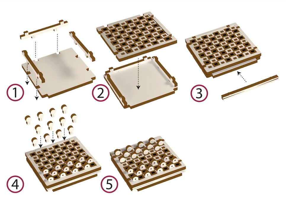 Це корисний інструмент, щоб урізноманітнити довгу подорож або скоротити час очікування в аеропорту чи на вокзалі не томлячись від нудьги. Гра легко розміщується в кишені і має спеціальне місце для шашок. Для складання цієї моделі клей не потрібен! Всі елементи були вирізані лазером. Вам потрібно лише акуратно відокремити деталі від планшету, на якому вони розташовані. Не забудьте покласти «Шашки» у кишеню із собою в подорож і Ви не помітите як промине час у дорозі!