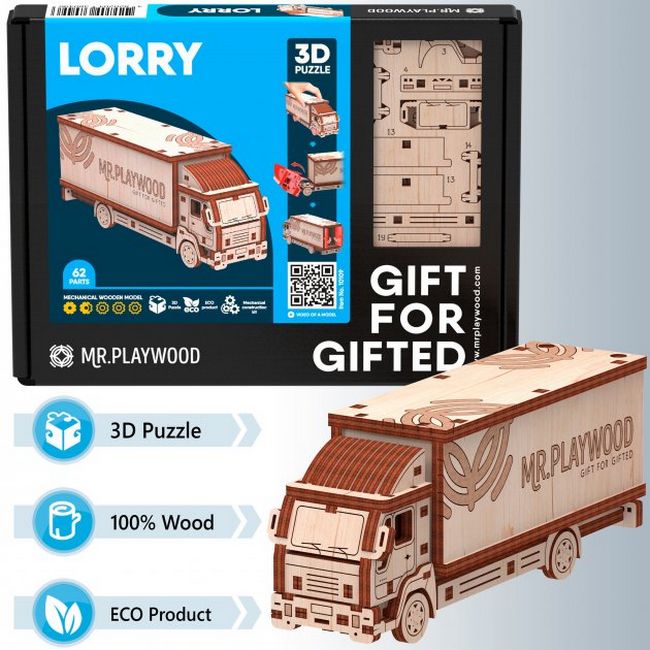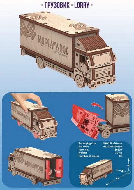 Маленька модель вантажівки легко може стати вашим улюбленим дерев'яним набором. Зберіть дерев'яний набір відповідно до інструкції. Коли вантажівка буде готова, ви можете відкрити двері та помістити в неї дрібні вантажі, щоб транспортувати їх до місця призначення. Акуратно від'єднайте деталі від пластин та зберіть дерев'яний набір без клею. Усі необхідні деталі входять у комплект. Збирайте та насолоджуйтесь Mr.Playwood!