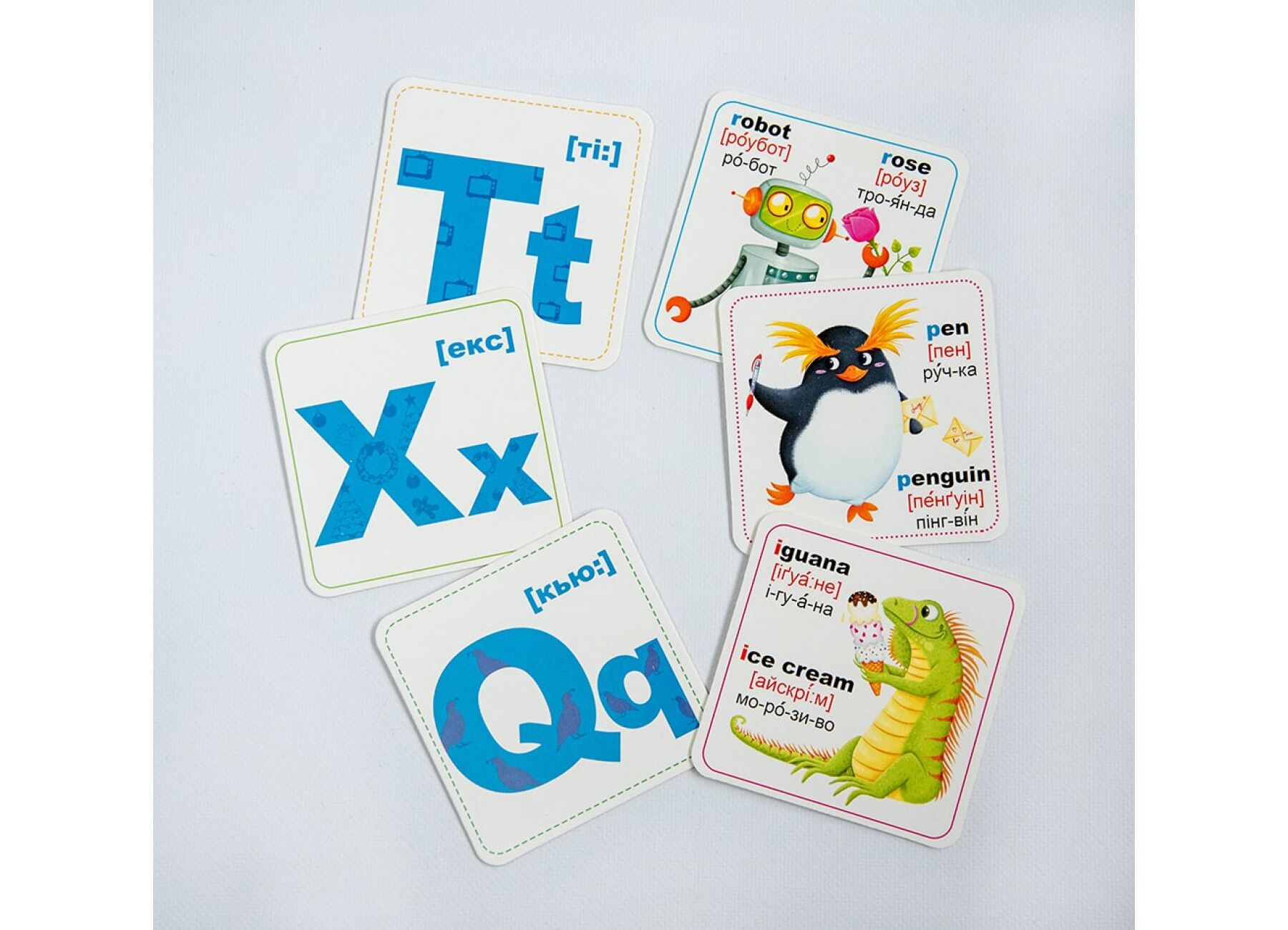 Розумні картки English ABC – це тренажер, який допоможе будь-якій дитині старше трьох років в ігровій формі вивчити англійський алфавіт. У набір входить 30 карток одного розміру. Зроблені вони зі щільного і приємного на дотик картону, що вирізняється стійкістю до деформацій. Для малюнків використана гіпоалергенна фарба, яка не виділяє небезпечних для здоров'я токсинів.