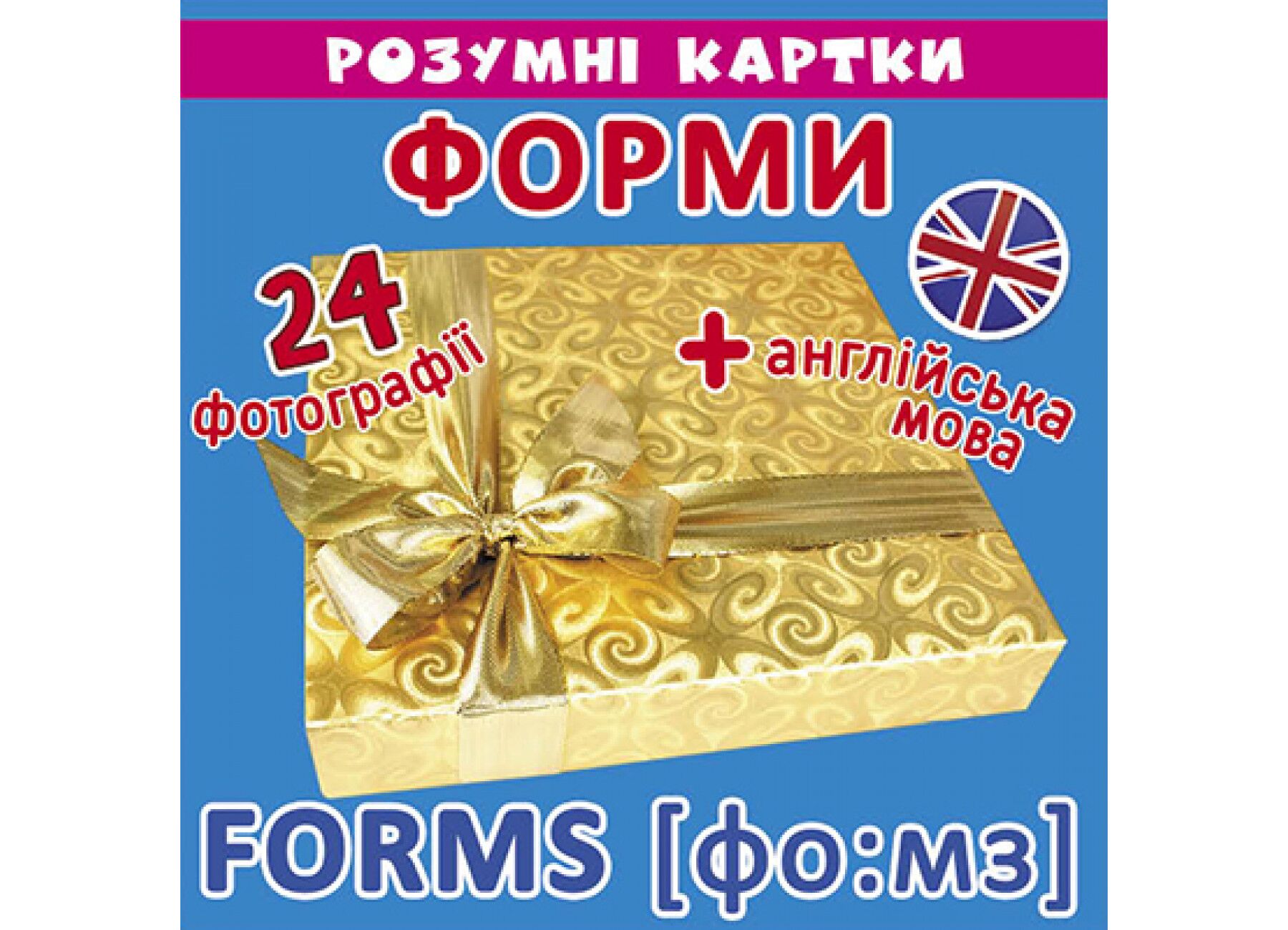Двадцять чотири картки містять українські та англійські назви форм (з українською транскрипцією), які закріплюють знання алфавіту і навички читання. Яскраві ілюстрації викликають у дітей непідробний інтерес, тренують асоціативне мислення і пам'ять. На зворотному боці карток «Форми» батьки знайдуть питання і завдання, які зроблять процес домашнього навчання ще більш захопливим і ефективним.