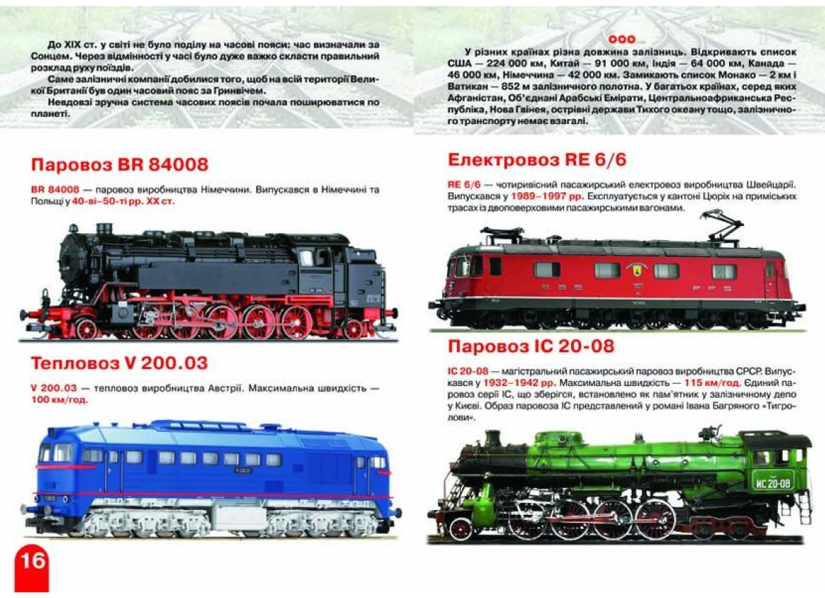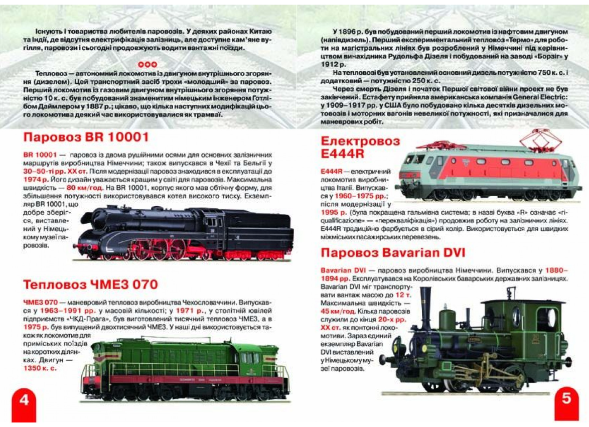 У книжці розказано про паровози, тепловози, електровози — старовинні та сучасні. Яскраві фотоілюстрації чудово доповнюють видання.