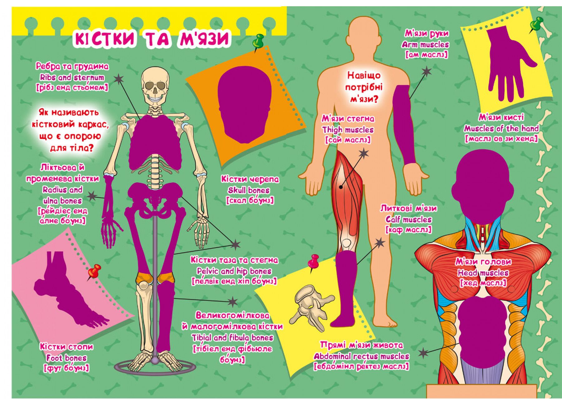 За допомогою цієї книжки ти познайомишся з внутрішніми органами та системами організму людини. Ти дізнаєшся багато нового про своє тіло й почнеш вивчати англійську мову. Наклей усі наліпки на відповідні місця. Дізнавайся про нове, вивчай англійську та пізнавай навколишній світ разом із цією книжкою!