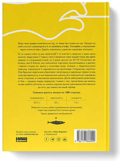 Авторка не пропонує готових рецептів. Вона наводить статистику, роздуми, спостереження, харчові тренди, після яких вам захочеться щонайменше переглянути власний раціон і вдумливо відбирати те, що потрапляє в продуктовий кошик.