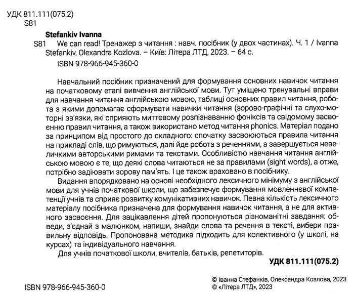 Навчальний посібник призначений для формування основних навичок читання на початковому етапі вивчення англійської мови. Тут уміщено тренувальні вправи для навчання читання англійською мовою, таблиці основних правил читання, робота з якими допомагає сформувати навички читання (зорово-графічні та слухо-моторні зв’язки, які сприяють миттєвому розпізнаванню фоніксів та свідомому засвоєнню правил читання, а також використано метод читання phonics.