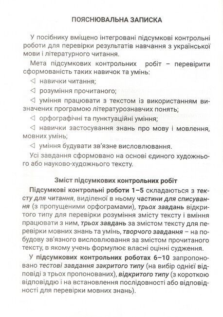 Пропоновані контрольні роботи призначені для підготовки до підсумкової перевірки навчальних досягнень учнів з української мови та читання наприкінці 4-го класу. Зміст завдань сформовано відповідно до державних вимог до навчальних досягнень учнів, визначених чинними навчальними програмами для 1–4 класів закладів загальної середньої освіти.