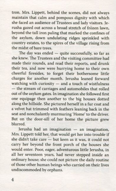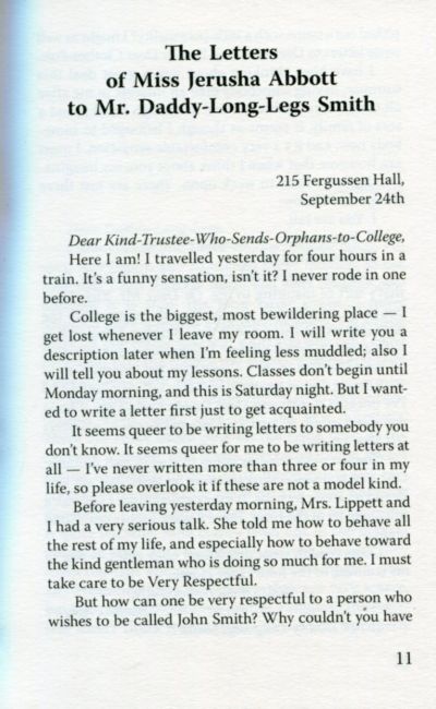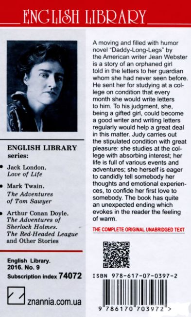 A moving and filled with humor novel “Daddy-Long-Legs” by the American writer Jean Webster (1876—1916) is a story of an orphaned Judy give told in the letters to her guardian whom she had never seen before. He sent her for studying at a college on condition that every month she would write letters to him. To his judgment, she, being a gifted girl, could become a good writer and writing letters regularly would help a great deal in this matter. Judy carries out the stipulated condition with great pleasure: she studies at the college with absorbing interest; her life is full of various events and adventures; she herself is eager to candidly tell somebody her thoughts and emotional experiences, to confide her first love to somebody. The book has quite an unexpected ending which evokes in the reader the feeling of warm and offers hope for happiness.