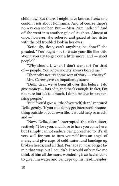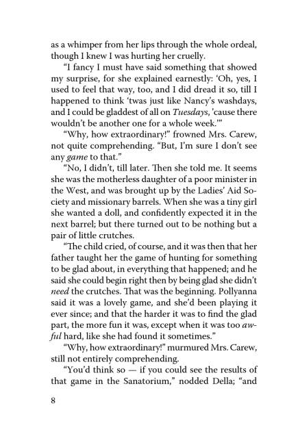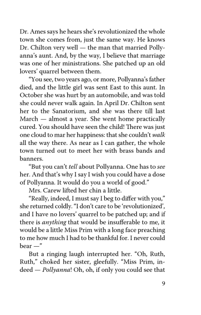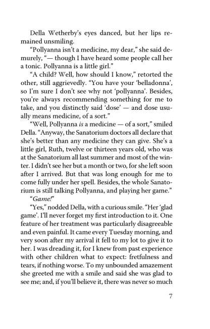 Pollyanna is growing up, and her life is full of both happy and sorrowful days. But she never forgets the glad game that her father taught her once. It is this game that helps the girl to find new friends, overcome life hardships, and even solve old family mysteries. Thanks to the heroine’s sincerity and optimism, quite several orphans manage to find loving families and Pollyanna herself — real friendship and love.