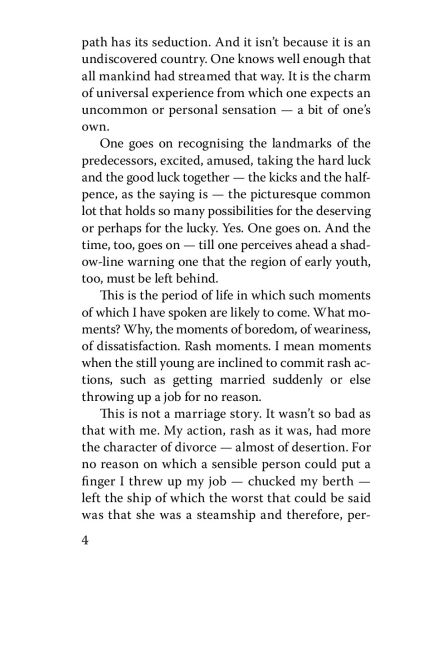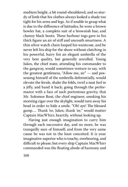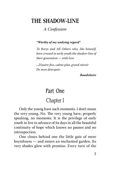 "Межа тіні" — це новела про морську подорож, яка розповідає про молодого капітана, що переживає важкі випробування під час свого першого командування кораблем. Це оповідання досліджує теми влади, відповідальності та моральних виборів у складних обставинах.