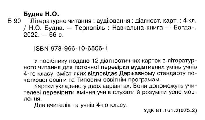 Діагностичні картки Літературне читання Аудіювання 4 клас НУШ Авт: Н.О. Будна Вид-во: Богдан 97432