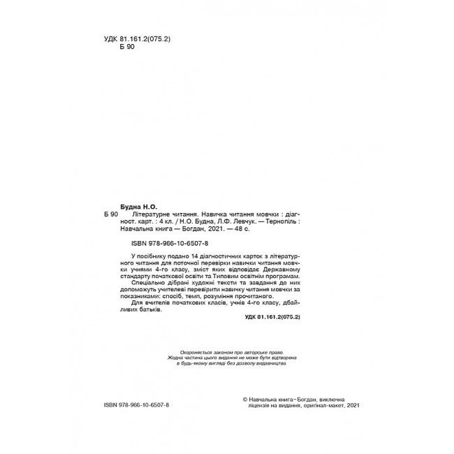 Нова українська школа НУШ Літературне читання 4 клас Навичка читання мовчки Діагностичні картки Будна Н. Богдан. У посібнику подано 14 діагностичних карток з літературного читання для поточної перевірки навички читання мовчки учнями 4-го класу, зміст яких відповідає Державному стандарту початкової освіти та Типовим освітнім програмам.