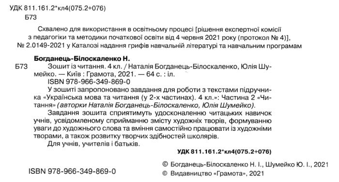 Зошит з читання 4 клас до підручника Наталії Богданець-Білоскаленко НУШ Нова українська школа Грамота.