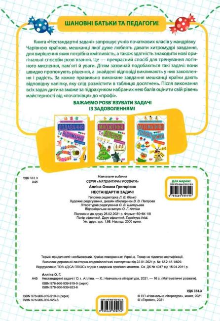 Математичні розваги Нестандартні задачі Алліна О. Торсінг. Книга «Нестандартні задачі» запрошує учнів початкових класів у мандрівку Чарівною країною, мешканці якої дуже люблять давати хитромудрі завдання для вирішення яких потрібна кмітливість, а також здатність знаходити нові оригінальні способи розв`язання.